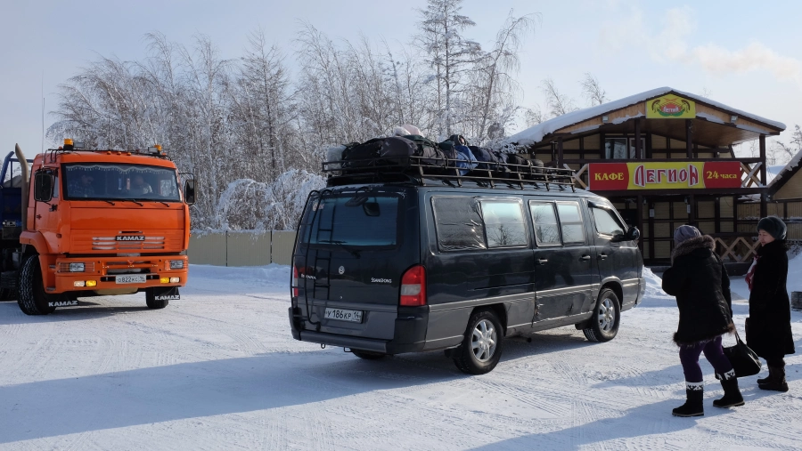 Aroaring KAMAZ truck struggles across massive potholes. Branches lash against the windows. The seats in the cabin are equipped with seat belts, and you’d better fasten them — otherwise you could go flying. We had a flat tyre on our way, but, fortunately, the driver of the KAMAZ behind us stopped to help us change it.