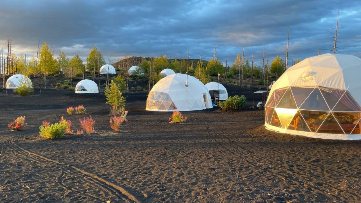 Further down the valley there is a dead forest. The first eruption covered it in ash like Pompeii, sucking the moisture from the ground and drying up the forest. For a long time, it was simply a frightening place which reminded people of Russian folk tales featuring Baba Yaga, but now it is a local tourist attraction with a comfortable glamping site built next to it. The view of the dead forest and towering mountains from these space-age tents with their wall-length windows is simply stunning in its beauty. TLR