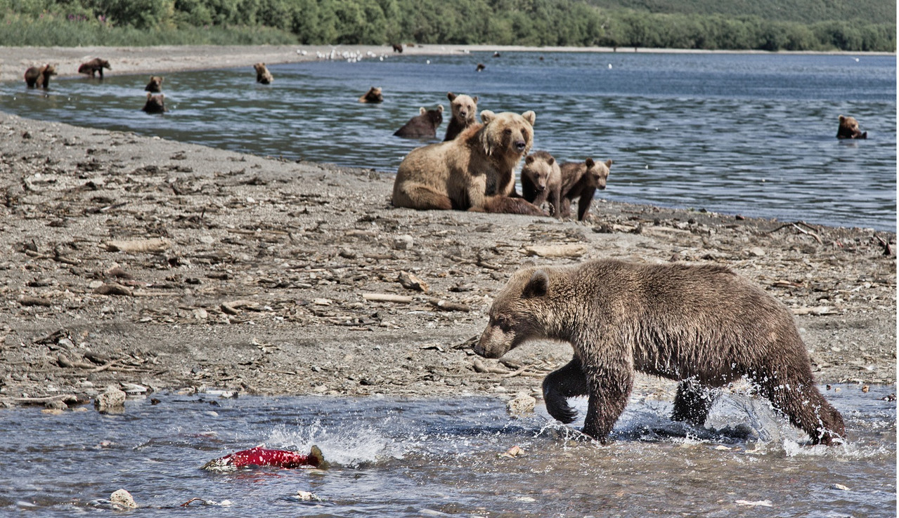 Although there are certainly lots of bears in Kamchatka, illegal fishing is stripping local rivers of spawning fish. Bears can no longer catch enough fish to accumulate sufficient fat to sleep through the winter. Hunger wakes them up in mid-winter and they cannot get back to sleep. There is no food in winter, so insomniac bears turn to people in search of something to eat. At the end of summer and in autumn, however, there are still plenty of fish and berries. If you hear a rustling in the bushes, it may well be a bear — but they rarely attack humans.
