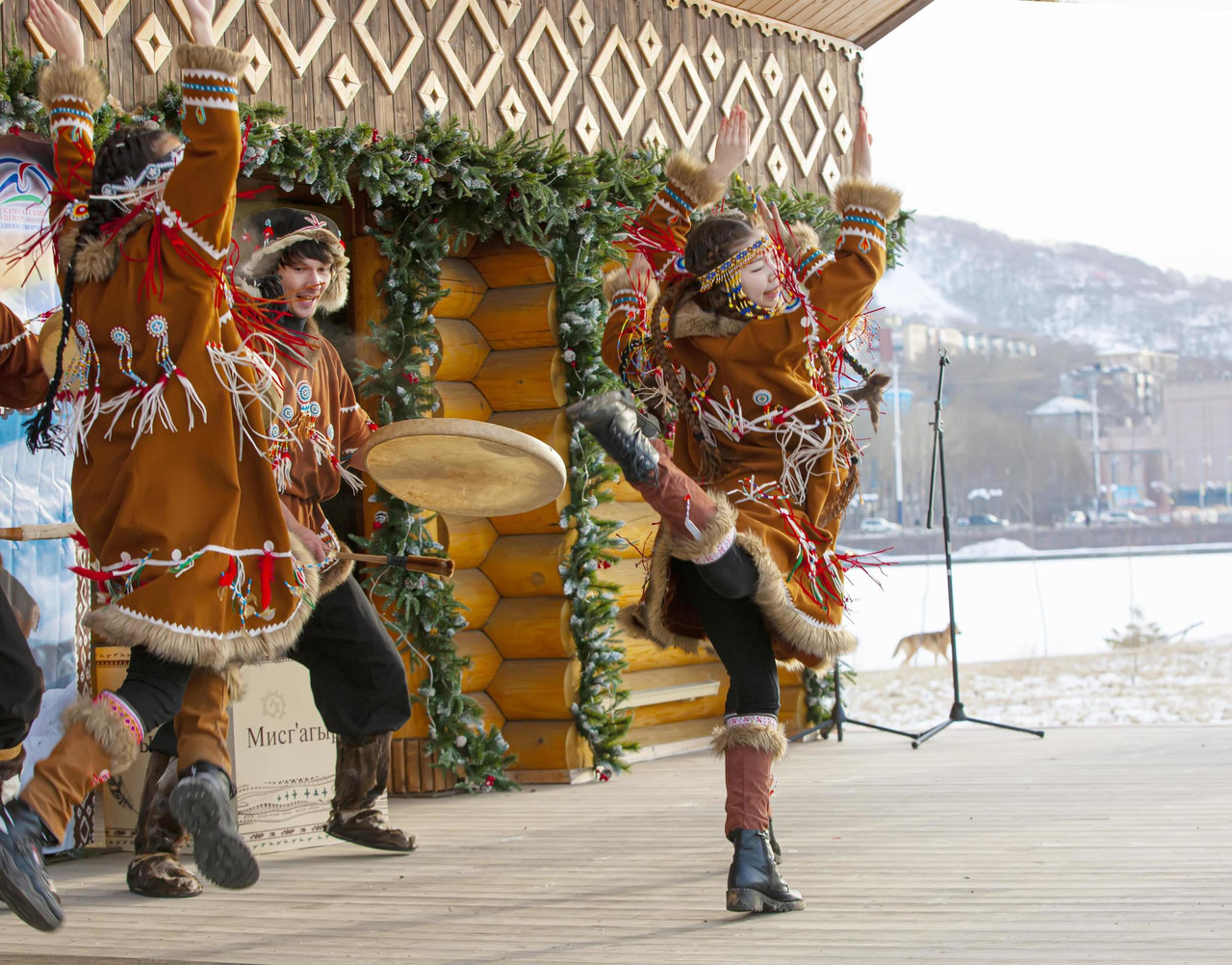Nulgur, a well-known Even ethnic dance ensemble, came to the community to give a concert. It was a professional ethnic performance rather than an amateur talent show, and they have toured around the globe. The group includes not only Evens, but also Koryaks and Chukchi. Some dancers emulate the American Indians and wear bun hairstyles. In fact, if they swapped their drums for tomahawks, you might not be able to tell them apart.